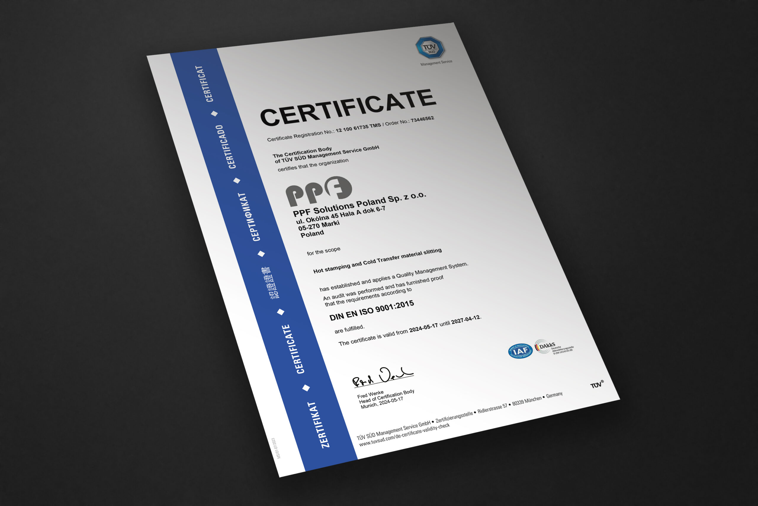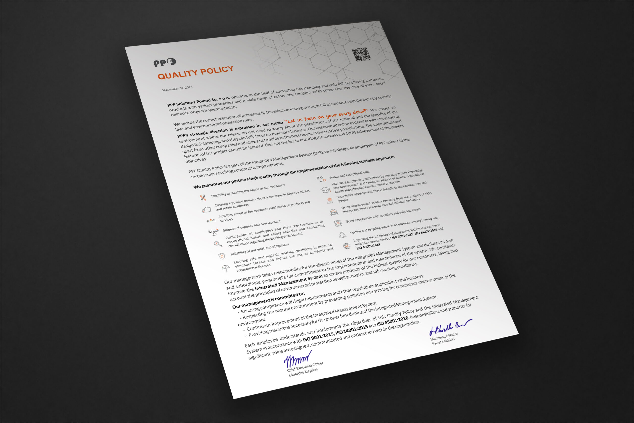 Our management takes responsibility for the effectiveness of the Integrated Management System and declares its own and subordinate personnel’s full commitment to the implementation and maintenance of the system. We constantly improve the Integrated Management System to create products of the highest quality for our customers, taking into account the principles of environmental protection as well as heathy and safe working conditions.